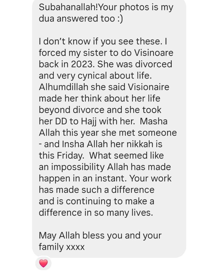 "I stopped thinking about the logistics of how my Duas could happen. Before Visionaire, I limited myself to what seemed possible. Now, I just make the Dua and watch as Allah makes the impossible happen."